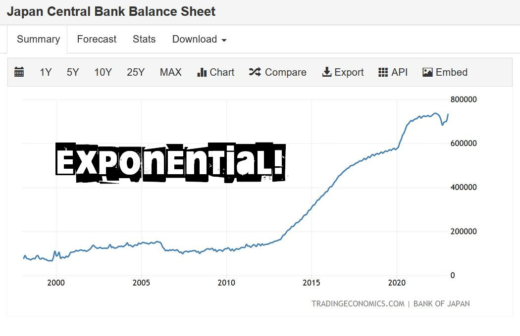 Japan provides us with a great example of this phenomenon. In these two charts we can see that the BOJ’s balance sheet has gone parabolic in the last decade while Japan’s money supply has only grown at a modest rate.