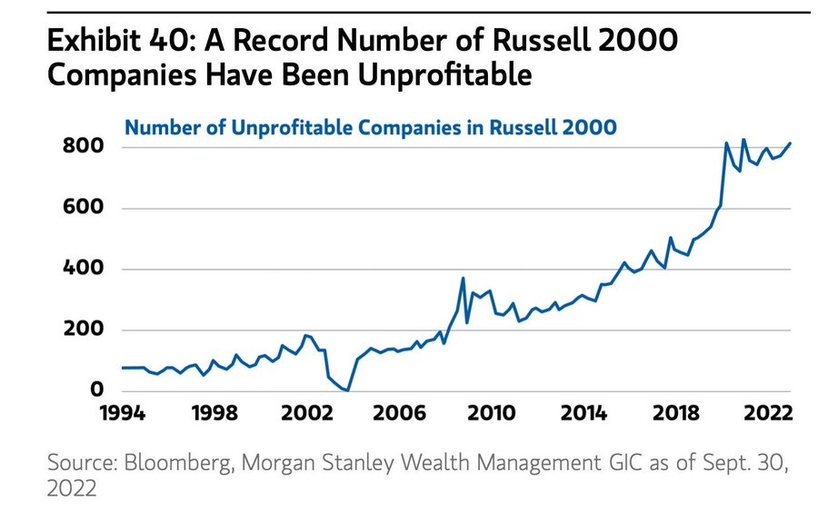 Howell estimates that a majority of all debt transactions are refinancing as opposed to new financing. The implications are profound. New debt is (semi) optional. A business can choose to put off an expansion or an entrepreneur can (hopefully) wait six months to get financing. However, debt refinancing is not optional. Approximately 40% of the companies in the Russell 2,000 are unprofitable which means that if they can’t roll over their debt at an affordable rate, those businesses will go bankrupt.